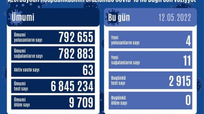 Azərbaycanda indiyədək ümumilikdə 792 655 nəfərin koronavirus infeksiyasına yoluxması faktı müəyyən edilib. Onlardan 782 883 nəfər müalicə olunaraq sağalıb, 9709 nəfər vəfat edib, aktiv xəstə sayı 63 nəfərdir.