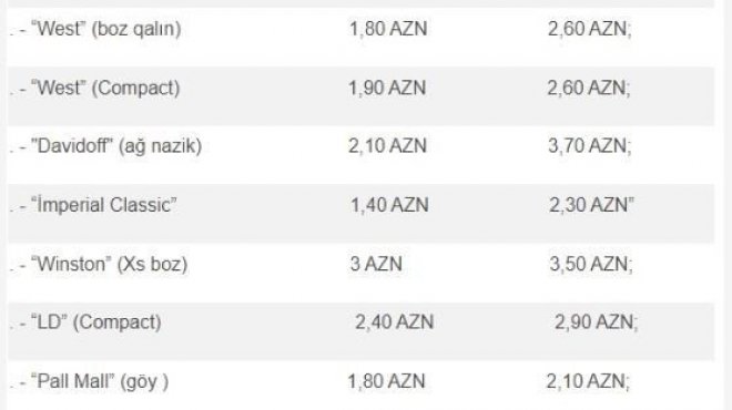 Paytaxt mağazalarında aparılan müşahidələrə əsasən, 20 gün əvvələ qədər “Sobranie” siqaretinin qiyməti 3,90 manat idisə, hazırda bəzi satış məntəqələrində 4,30 – 5 manat aralığında təklif olunur. Eynilə “Winston” 3,20-dən 3,80-ə, “Kent-4” 3,70-dən- 3,90-a, “Davidoff studio” 3,60-dan 4 manata, “Winston” ballı isə 3,50-dən 3,80 manata qədər bahalaşıb. Hazırda paytaxt mağazalarında digər markalarla müqayisədə nisbətən normal hesab olunan siqaretlərin qiyməti 3-4 manatdan ucuz deyil. Daha ucuz və keyfiyyət baxımından yaxşı olmayan siqaretlərin qiyməti isə iki manatdan başlayır.