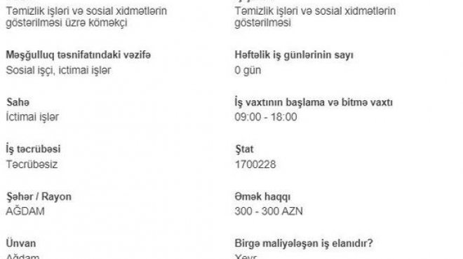 Qarabağ üzrə Dövlət Məşğulluq Mərkəzlərində işsiz və iş axtaranlara təklif olunan müxtəlif məvacibli işlərin siyahısı vətəndaşlarda böyük maraq doğurur. Avtosfer.az-ın məlumatına görə, iş axtaran hər kəs e-sosial.az portalı üzərindən Məşğulluq Alt Sisteminə daxil olaraq işsiz və iş axtaran kimi öz qeydiyyatını apara bilərlər.