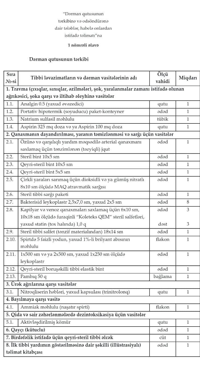 Avtomobillər üçün nəzərdə tutulmuş ilkin tibbi yardım çantasında hansı dərman vasitələrinin olması ilə bağlı Azərbaycan Respublikası Nazirlər Kabinetinin 2019-cu il 9 sentyabr tarixli 399 nömrəli Qərarı təsdiq edilib. Sürücülər üçün faydalı olacağını nəzərə alaraq Avtosfer.az bir daha bildirir ki, həmin qərara əsasən ilkin tibbi yardım çantasında aşağıdakılar olmalıdır: