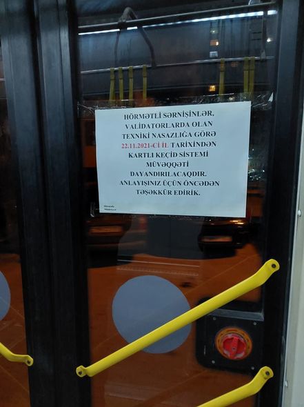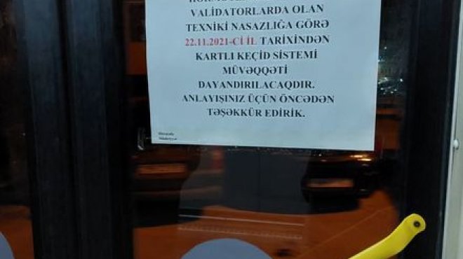 Noyabrın 22-dən etibarən validatorlarda olan texniki nasazlıq səbəbindən kartla keçid sistemi müvəqqəti dayandırılacaq.