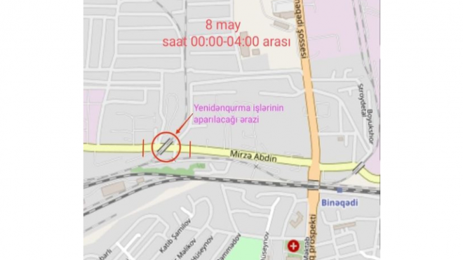 Binəqədi rayonu, Mirzə Abdin küçəsində (Biləcəri-Baksol yolu) yerləşən dəmiryolu körpüsündə aparılan yenidənqurma işləri ilə əlaqədar olaraq bu gecə saat 00:00-04:00 arası avtonəqliyyat vasitələrinin hərəkəti tam məhdudlaşdırılacaq.