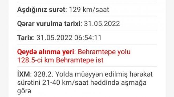 İmişli rayonun Bəhramtəpə qəsəbəsində sürət həddi 90 km/saat olan yolda 99-YP-978 dövlət nömrə nişanlı yol polisi avtomobili 129 km/saat sürəti ilə radara düşüb.