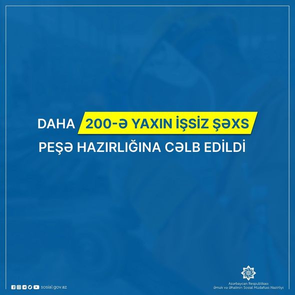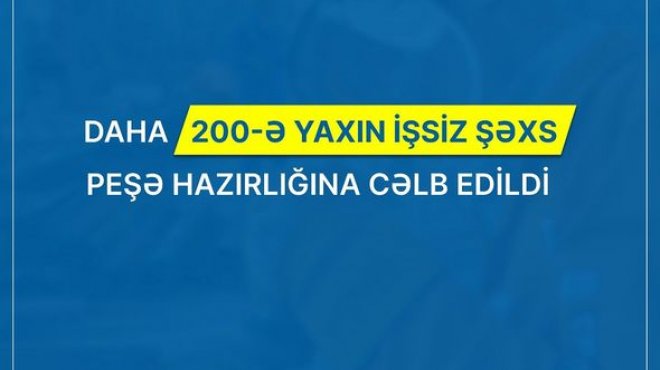 Əmək və Əhalinin Sosial Müdafiəsi Nazirliyinin tabeliyindəki Dövlət Məşğulluq Agentliyinin Bakı və Göyçay Peşə Hazırlığı Mərkəzlərində 200-ə yaxın işsiz şəxs üçün peşə hazırlığı kursları təşkil olunub.
