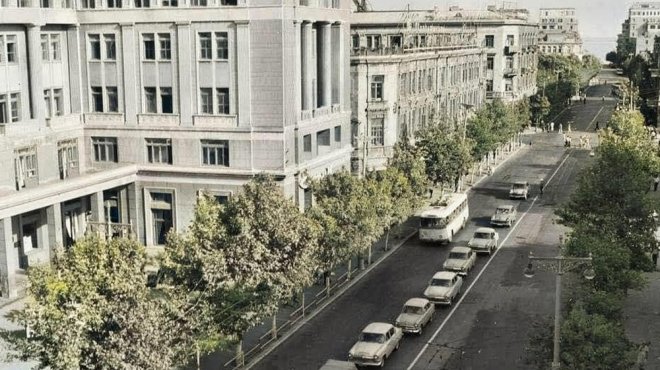 Fotolarda Bülbül prospektində piyadalar üçün salınan geniş səkinin dağıdıldığı, ağacların kəsildiyi, yerin asfaltlandığı və yolun parkinqə çevrildiyi görünür.